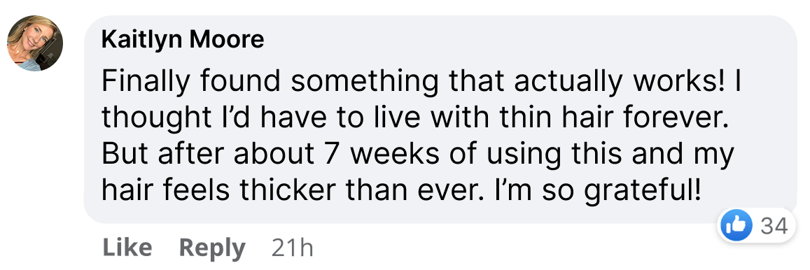 "Finally found something that actually works! After my divorce and all the stress that came with it, my hair started falling out in alarming amounts. I'm 47 and thought I'd just have to live with thin hair forever. But after about 7 weeks of using this, I noticed my part wasn't as wide anymore. Now at 3 months, my hair feels thicker and I'm seeing these cute little baby hairs everywhere."
